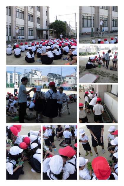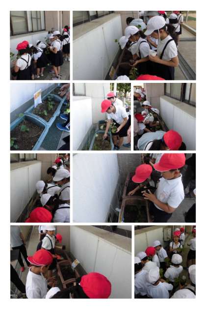 少し狭いですが、校舎沿いに置かれたプランターに子どもたちが頑張って植え付けました。ヘチマの葉っぱを触って、「柔らかい!」と驚いている児童や葉っぱの裏側まで観察している児童もいました。