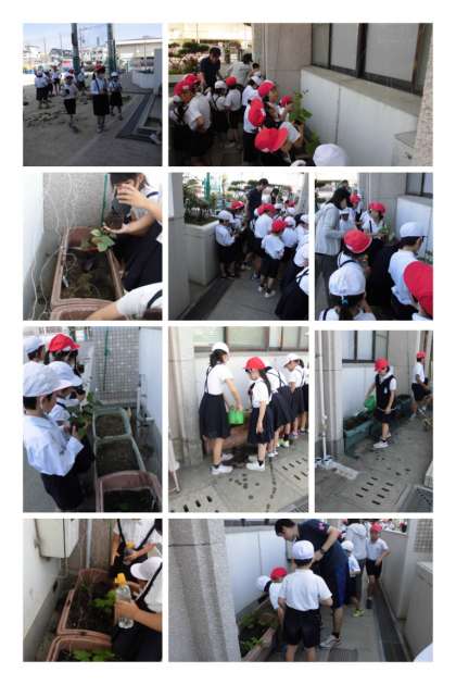 5月16日(木)、全校児童で緑のカーテンの苗の植え付けをしました。琉球アサガオやゴーヤ、ヘチマにひょうたんとツルを伸ばしてグングン成長する植物を植えました。