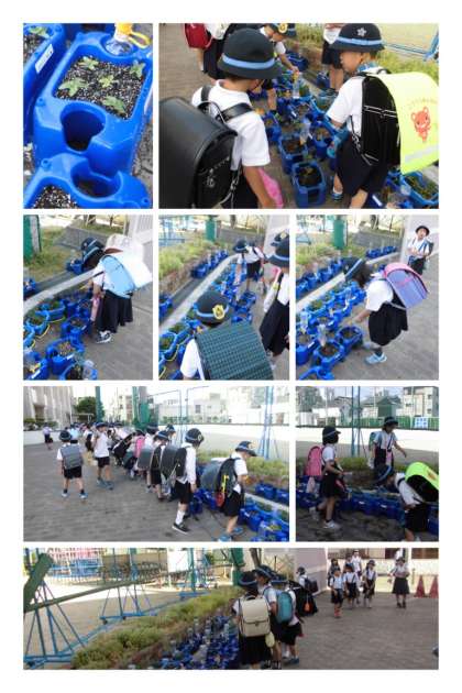 5月22日(水)、1・2年生は、朝登校すると、ランドセルを背負ったまま、「アサガオ」や「ミニトマト」の水やりをします。