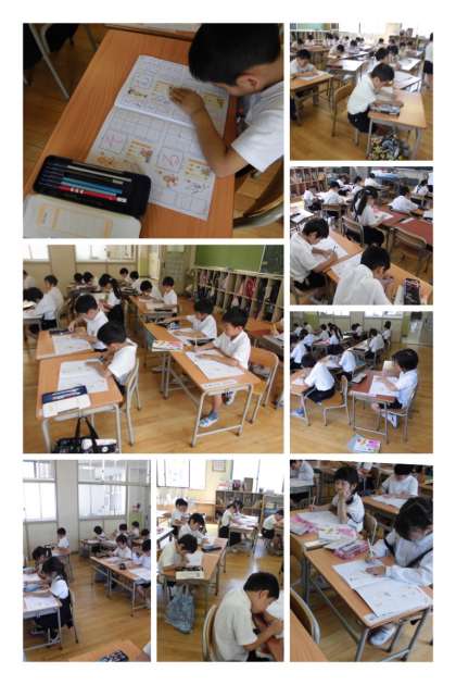1年生は、ひらがなが書けるようになってきました。お手本をなぞって、自分で書いて。できれば先生に見てもらいます。