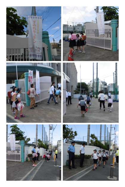 午前8時前から保護者や地域のボランティアの皆さんと一緒に子どもたちが登校して来ました。校門前には、大正警察署の方も応援に駆けつけてくださいました。
