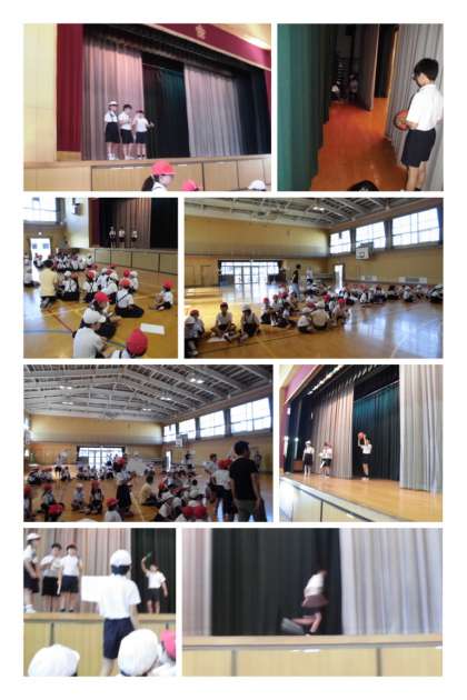 幕と幕の間をバスケットボールやスリッパ、帽子を通し、「今のは、何でしょうか?」と問題を出し、縦割り班で答えました。