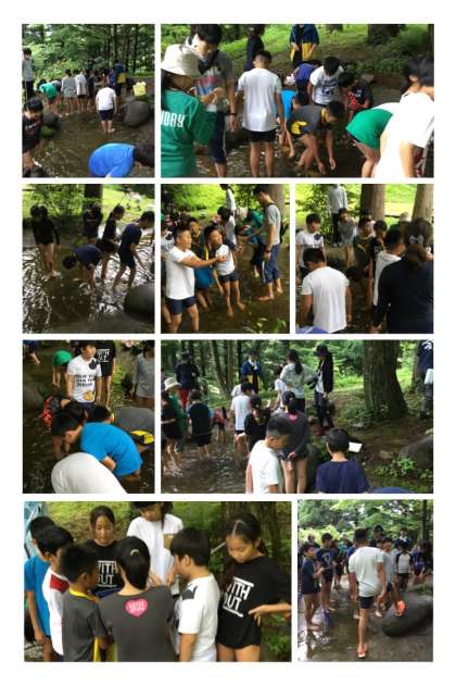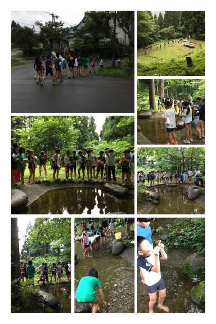 木陰の小さな池で魚つかみです。ちょっと気温が低いですが、みんな、水に入って楽しそうです!!