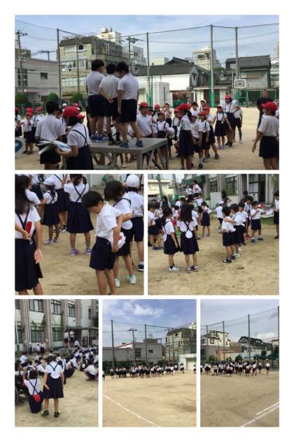 縦割り班のA・Bを赤白に分け、赤白帽をシッポにして準備は完了。集会委員の「よーいスタート!」の合図で鬼ごっこが始まりました。低学年も高学年も関係なく、シッポをとり合います。二回戦では、5秒以上同じ場所で止まってはいけないというルールも加わり、子どもたちは朝から走り回り、汗をかきました。結果は、一勝一敗、汗をきっちり拭いて、学習を始めてください!!