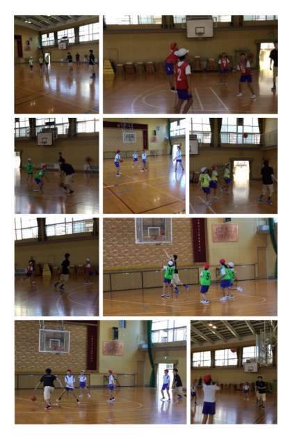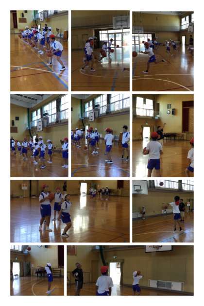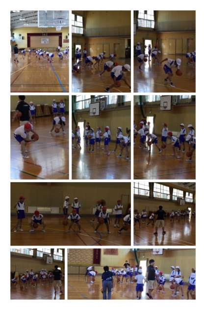 準備運動をして、ボールの扱い方やドリブル、シュートを習いコーチとゲームをしました。二人のコーチに4人の子どもたちがチャレンジしますが、歯が立ちません。軽くダンクシュートも決められました。子どもたちは、とても楽しんで体を動かすことができました!!