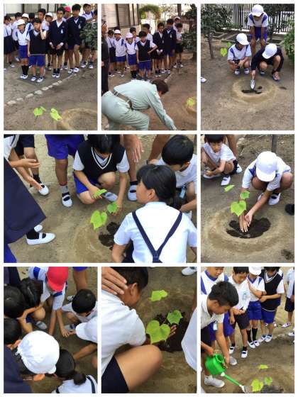 10月17日(木)、6年生が修学旅行で見学した平和記念資料館でいただいた「アオギリ」の苗を植樹しました。原爆が落とされた時も枯れずに生き続けた「アオギリ」です。平和を願う心と共にしっかりと育てもらいたいですね!!