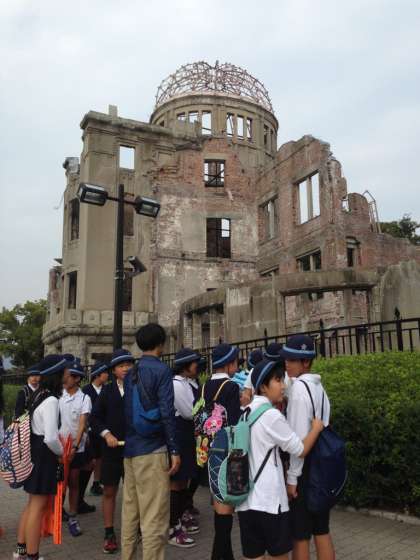 予定を少し変更し、平和記念公園ではなく爆心地・原爆ドームにむかいました。写真では何度も見ている原爆ドームですが、やはり本物はすごい!一目見るだけでも何か胸にこみ上げてくるものがあります。戦争の悲惨さ、平和の大切さを感じたひと時でした。