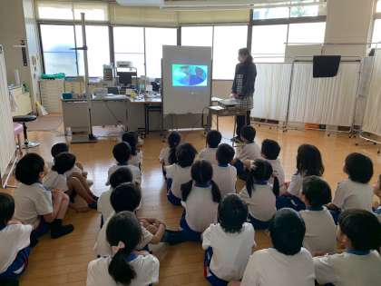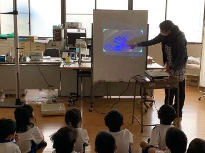 1月8日(水)の発育測定の際、風邪の予防に役立つ、正しい手洗いの仕方について学びました。動画で汚れが落ちにくい部分を確認した後、手洗いの歌に合わせて洗う練習をしました。