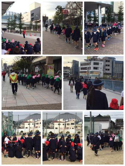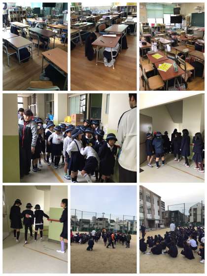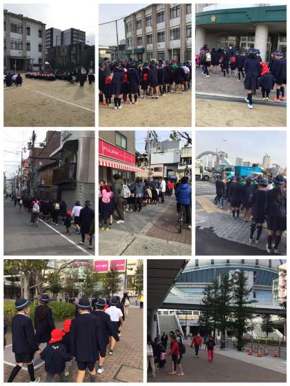 「大きな地震が発生しました」と放送が流れると子どもたちはすぐに机の下に身を伏せ、次の放送で運動場に素早く集合しました。三西幼稚園の園児も合流し、津波から避難するために京セラドームへ向かいました。5年生は年少の園児と手をつないで、見守りながら歩きました。京セラドーム前で集合し、校長先生から「お・は・し・も」に加えて「な(泣かない)」も低学年の児童や園児のみなさんは心がけましょうと話がありました。学校に戻り、園児とお別れするときは、お互いに名残惜しそうでした!!