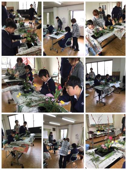 華道体験では、一人ひとりが春の花々を用意していただき、先生が活けた見本を自分なりにアレンジして花を切り、剣山に活けていきました。みんな、出来上がった自分の作品に満足そうでした!!