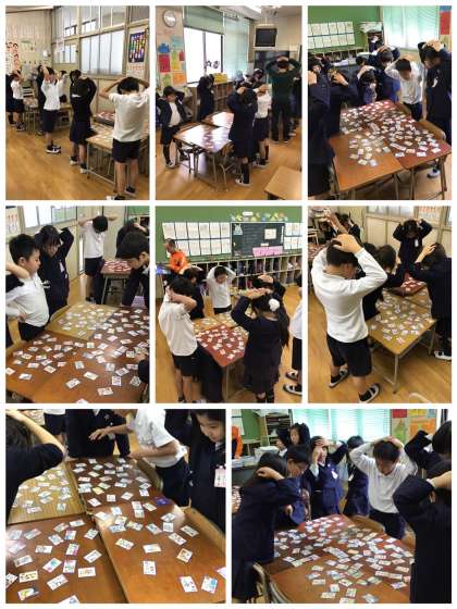 2年生はお手つきをしないように、先生がフダを読み始める時は手を頭に乗せるルールを決めていました。