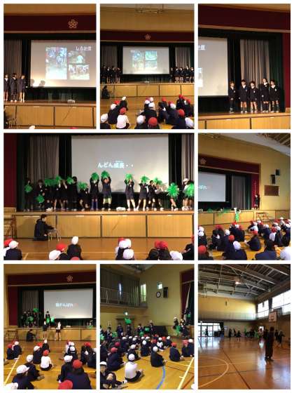 1月30日(木)、児童集会で5年生の発表がありました。総合的な学習の時間で行った米の栽培の記録を劇にしてくれました。