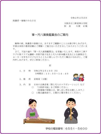 本校三西クラブ「ハーモニーお箏クラブ」の元講師の先生方による演奏会を4・5・6年生が鑑賞します。保護者、地域のみなさんもぜひご一緒に鑑賞してください。<(_ _)>