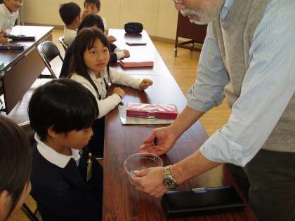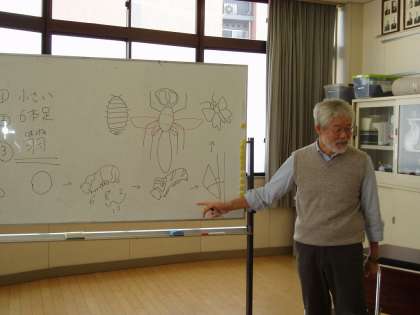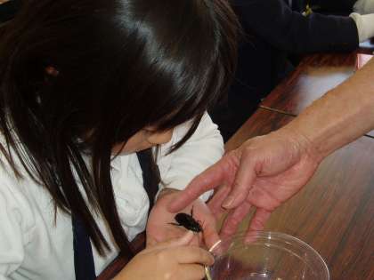 箕面にある昆虫館よりゲストティーチャーをお招きし、「移動こん虫教室」を行いました。足は6本ということは教科書にも書かれてありましたが、さらに詳しく胸の3つの部分から1対ずつ出ていることを説明してくださいました。聞いた子どもたちは、「へえ、胸も3つの部分に分かれるのか。」「やっぱり2本ずつのセットになっているんだな。」などと口々に話し、感心していました。
