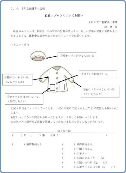 給食のエプロンは、来年度、次の学年の児童が使います。新しい学年の児童が気持ちよく使えるように、休業中に給食用エプロンのチェックをお願いします。詳細は、配付されるプリントをご覧ください。