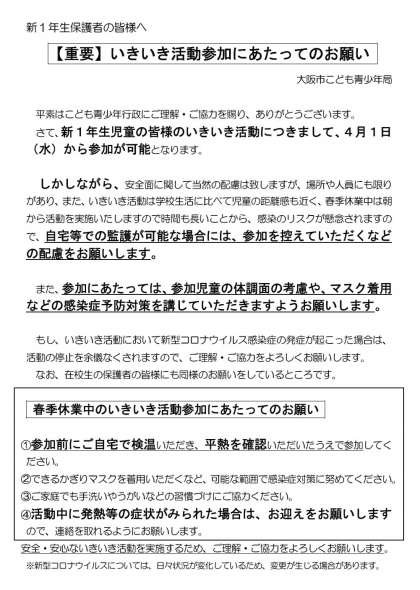 【新1年生保護者の皆様】いきいき活動参加にあたってのお願い