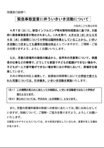 4月9日(木)、学校休業中のいきいき活動の対応について、お知らせします。