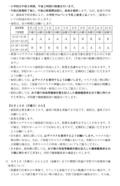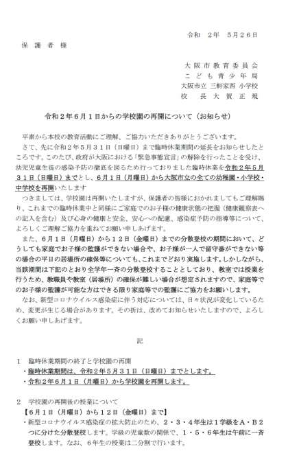 5月19日(火)、大阪市教育委員会から6月1日からの学校再開についての通達があり、本校では、下記の要領で学校を再開し、授業及び給食を実施します。