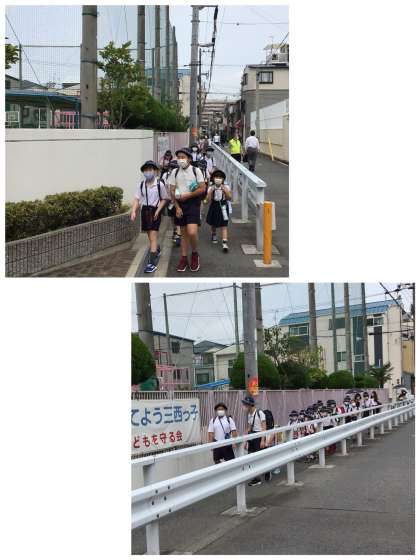 6月16日(火)、集団登校が始まりました。各班長が先頭に立ち、2列にきっちりと並んで登校していました!!
