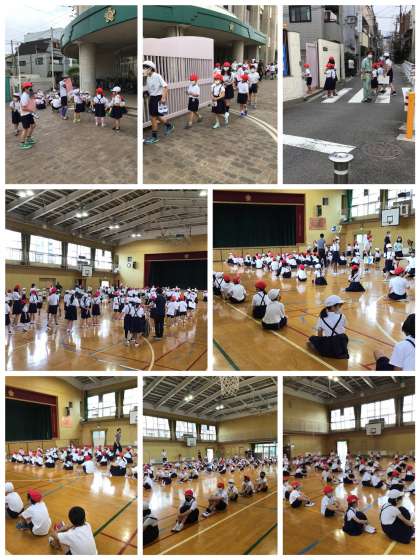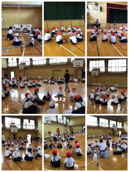 6年生が1年生を連れて体育館に行き、他の学年と合流しました。いつもは、頭を突き合わせて話し合いをするのですが、今、ソーシャルディスタンスを守り、体育館をいっぱいに使って、自己紹介などをしました!!