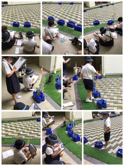 7月13日(月)、先週からずっと雨が止みません。2年生がトマトの観察を中庭でしていました。「あとで分かりやすく、説明できるように観察日記を書くにはどうしたらいいかを考えて書いてね。」とアドバイスされ、遠くから見たり、近くから見たり、上から見たりしていました。