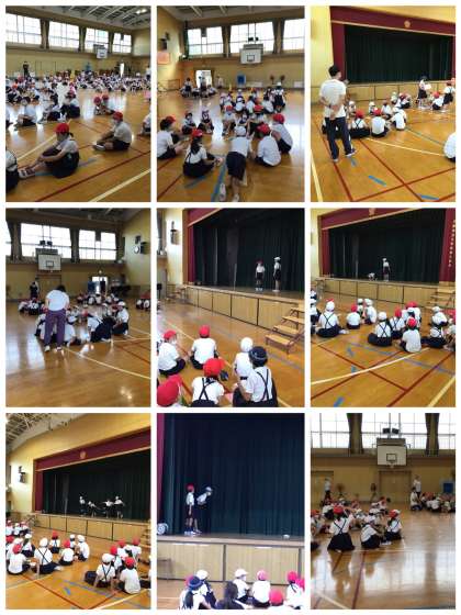 9月3日(木)、今日の児童集会は、集会委員が「どちらが勝つでしょう」というゲームをしてくれました。ルールは簡単で、集会委員が、「ジャンケン」や「息止め」、「片足立ち」などで対決し、どちらが勝つかを縦割り班のみんなで予想して当てるゲームです。
