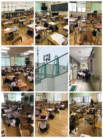 屋上のスピーカーから地震を報せる放送が聞こえると、子どもたちは一斉に机の下に身を隠しました。続いて、大津波警報の放送では、帽子をかぶり、先生の指示を聞いていました。