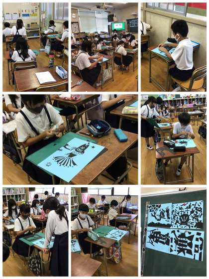 ? 10月1日(木)、4年生の図画工作の授業の様子です。黒い画用紙をカッターナイフで切って貼り絵をしていました。切り端もみんな使って、ゴミを出さないようにも工夫していました。魚をモチーフにした作品が多かったです!!