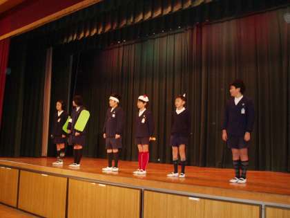 今日は、給食週間にあわせて給食集会を行いました。給食委員会の子どもたちが「ももたろう」の劇を披露しました。朝ごはんを食べた時の「ももたろう」は強いが、食べていない「ももたろう」は、まったく力が出ません。笑いをまじえた熱演で、「朝ごはんを食べよう。」とみんなにうったえかけることができました。