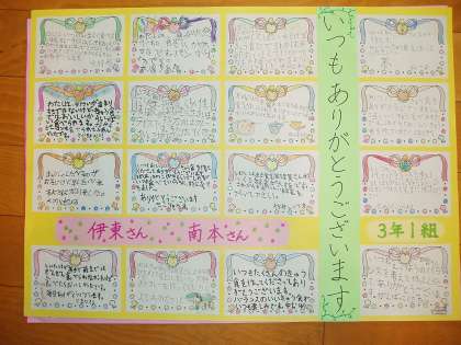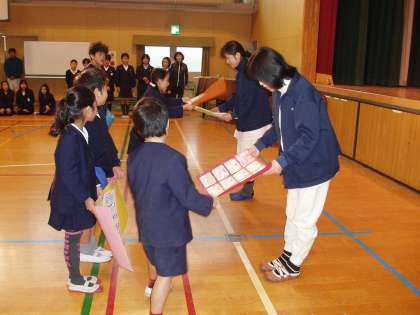 その後、一人一人の児童が感謝の気持ちを書いた寄せ書きをプレゼントしました。「ぼくは、給食が毎日楽しみです。これからもいっぱい食べたいです。」「いつもおいしい給食をありがとうございます。」などそれぞれの思いを述べた後、調理員さんに手渡しました。給食調理員さんとも交流ができ、楽しい集会となりました。