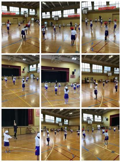 体育館に集合した子どもたちは準備体操をして、最初は基本のポーズから教えていただきました。