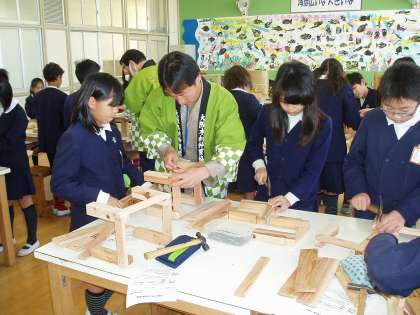 次は高学年です。5年生は、大阪木材仲買協同組合の皆様にご指導いただいて、木工にチャレンジしました。ビデオで木の素晴らしさを学んだあと、自分たちも製作に挑戦しました。足が斜めにならないように気をつけて、丁寧に釘を打っていました。木の温かさを活かした素敵な置台を完成させることができました。