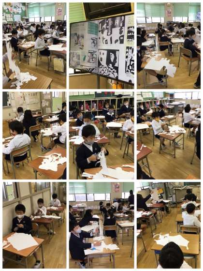 11月13日(金)、2年生の図画工作の授業の様子です。「ハサミのアート」に取り組んでいました。