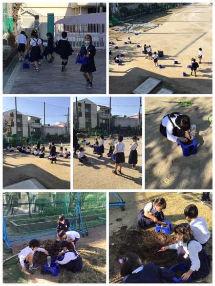 11月17日(火)、1年生が生活科の時間にチューリップの球根を植えていました。