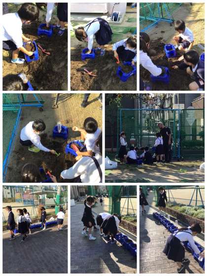 春から夏にかけてアサガオを栽培していたプランターの土を入れ替え、一人一つの球根を植えました。来年の春には、色とりどりの花を咲かせ、新入生を迎えてくれるでしょう。