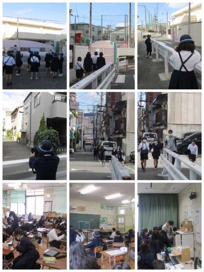 大きな地震の時、倒れてきそうな壁はないか、落下してきそうな看板はないかをチェックしていました。学校へ戻ってから、みんなの集めた情報をまとめていました!!