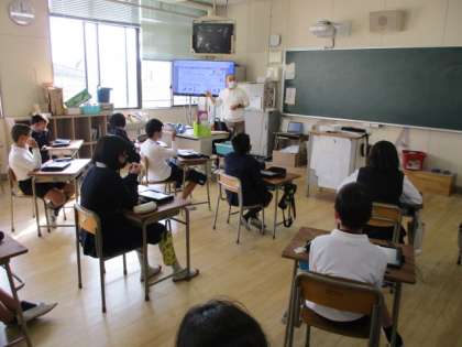 先月に続き、6年生がタブレット端末を使って双方向通信を体験しました。
