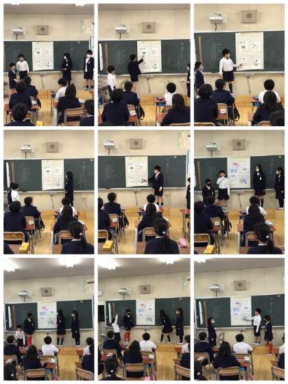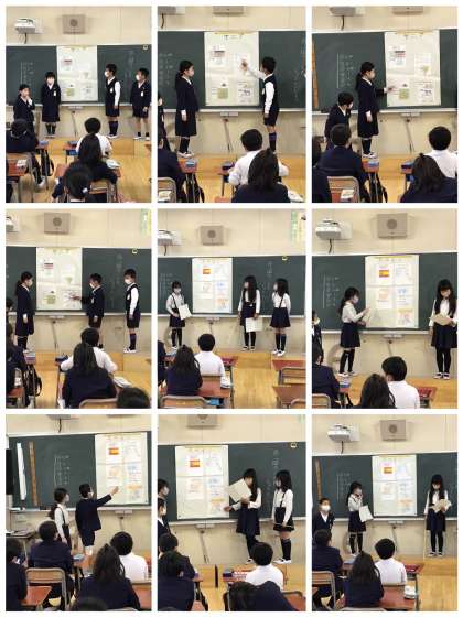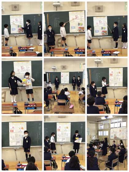 国旗の由来や言葉、美味しい食べ物や観光スポットまでを詳しく調べて発表していました。掲示した資料に手書きで食べ物や国旗を描いたグループもあり、みんなが自信を持って堂々と発表していました!!