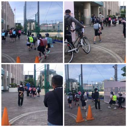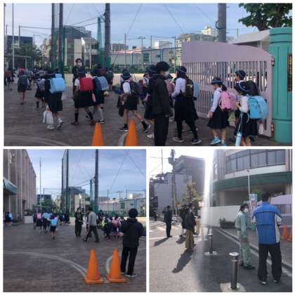 地域の皆さん、保護者の皆さんに見守られて、みんなで子どもたちが登校して来ます。