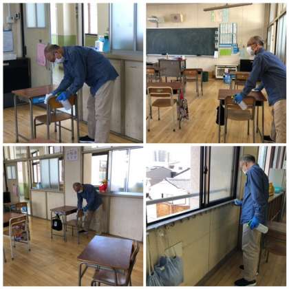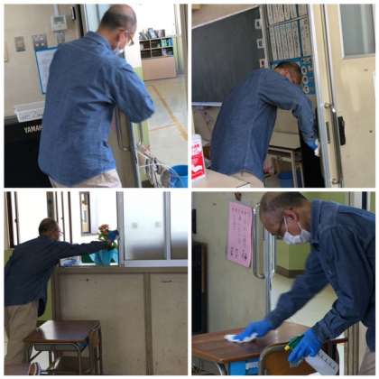 スクールサポートスタッフには、最初に図書室、図工室を消毒してもらい、その後、クラス担当が清掃をした教室をまた、消毒します。