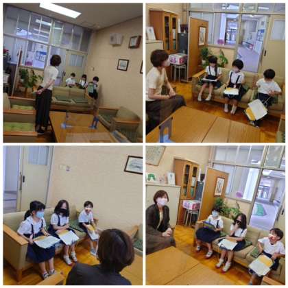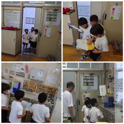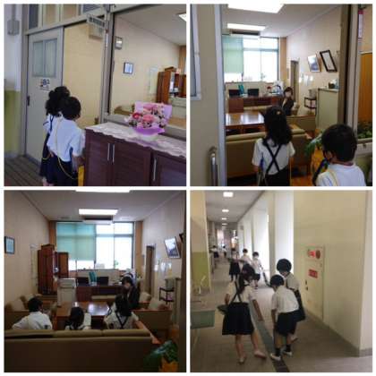 校長室、職員室、保健室、音楽室、理科室、事務室と子どもたちは、興味津々です。