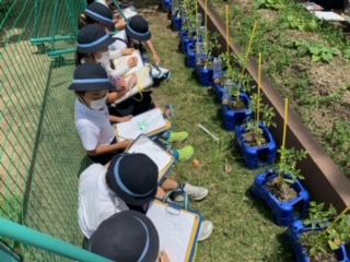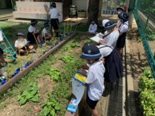 「葉っぱの形がハートみたい」「葉っぱの表はつるつるしてるけど、裏はざらざらしてる」など、思い思いの表現方法で観察カードに記録していました。また、観察が早く終わった子は、進んで草取りもしていました。