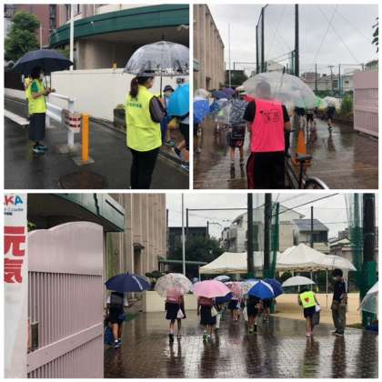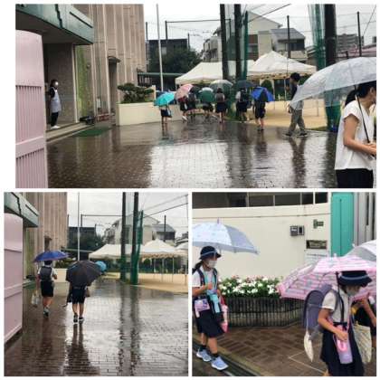 雨の中ですが、保護者の皆さん、地域の皆さんに見守られての登校です。