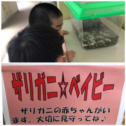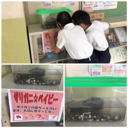 職員室の前にザリガニの赤ちゃんがいます。