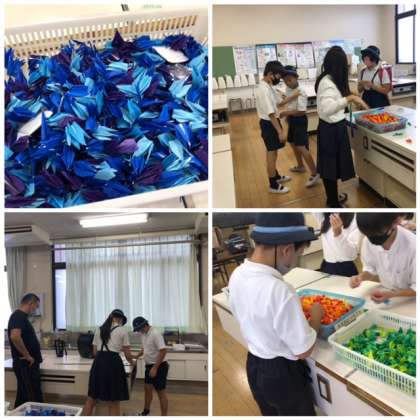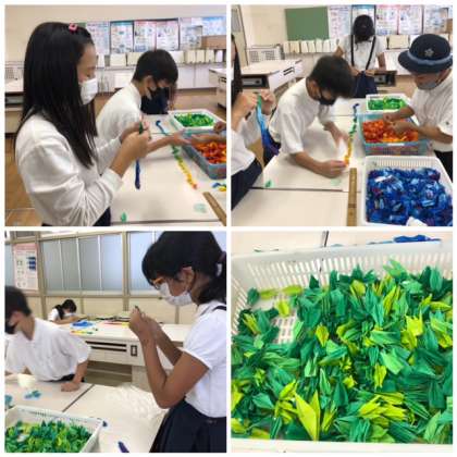 来週に修学旅行を控えた6年生が、折り鶴をつなげています。