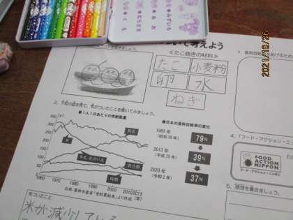 日本の食料自給率について教えてもらい、その変化のグラフを見て気づいたことを発表しました。