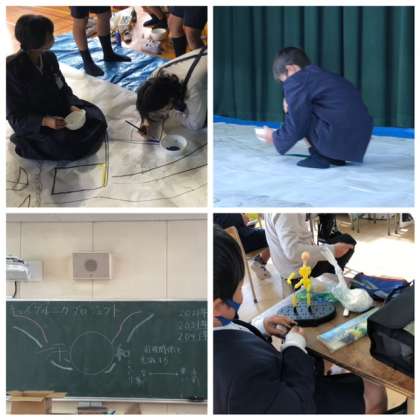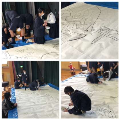 講堂で「キッズゲルニカプロジェクト」教室で「将来の自分」に取り組んでいます。