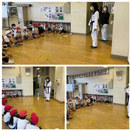 夢授業は、4.5.6年だけですが、テコンドーオリンピック選手の岡本さんと、アシスタントの山下さんが、1年から3年の教室をまわってくださいました。