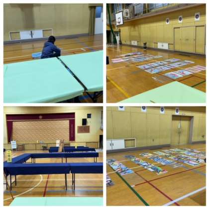 子どもたちの作品の展示に向けて、教職員が丁寧に準備をしています。