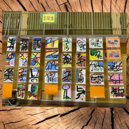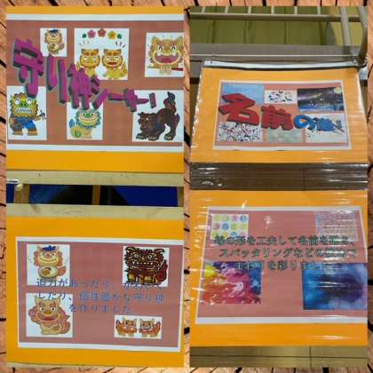 線の形を工夫して名前を描き、スパッタリングなどの技法でまわりを彩りました。